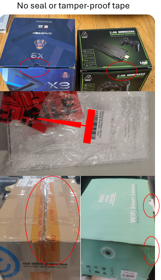 The products are in original packaging and the packaging is tamper-proof OR secured with security tape. NOT ALLOWED